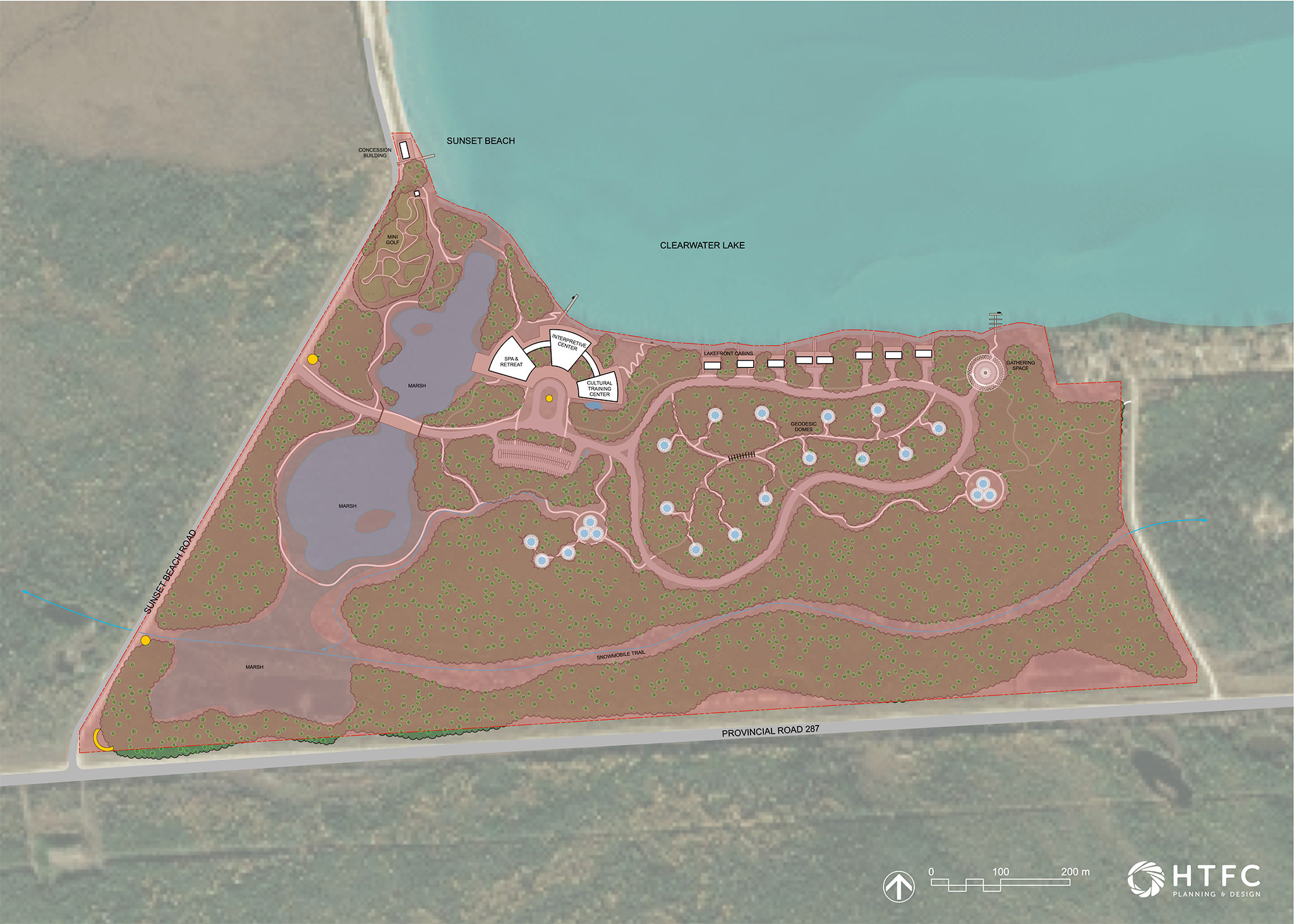 People from Europe and other parts of the world are looking for Indigenous cultural tourism and ecotourism destinations. The Master Plan proposes developing this area as a resort that would include an interpretive centre, cultural training centre, spa and retreat area, gathering spaces, and cabins, yurts, domes or tipis to rent along the waterfront. The plan includes hubs for more group events, treatments and forest bathing opportunities in the wooded areas, a gathering space along the water and a mini golf course and concession stand closer to the existing Sunset Beach area in the Provincial Park to take advantage of traffic.