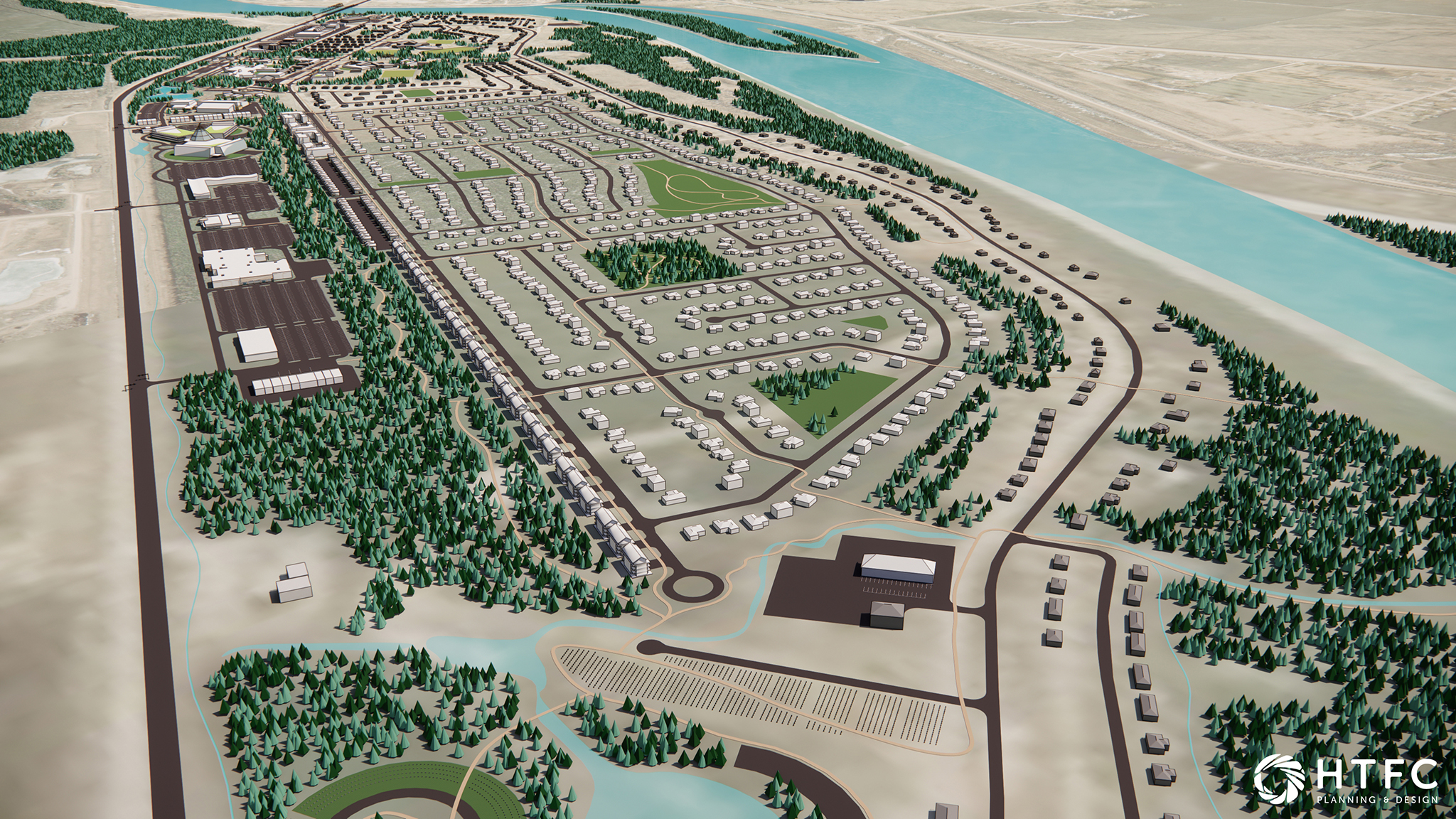The public works yard will be relocated to the west of Amisk 2 off Kiche Maskanow, around the existing fire hall. Further to the northwest, the existing cemetery (which is nearing capacity) may be expanded and beautified with a small pond, which would help to control stormwater.