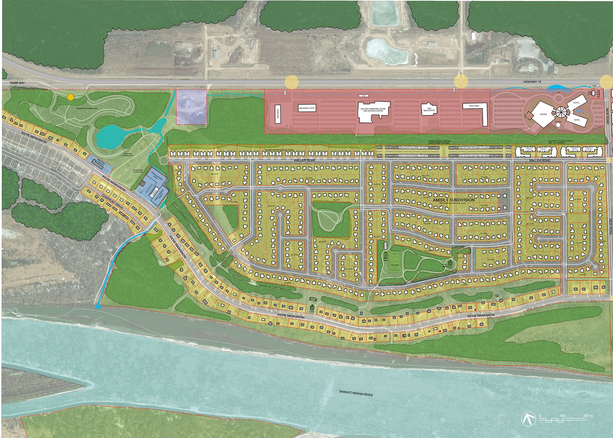 The Amisk 2 residential subdivision will be located between the commercial area and Kiche Maskanow. It will be separated from the highway commercial area by a forested buffer, but still accessible by walking paths. Amisk 2 will provide Opaskwayak with more than 500 new single-detached houses and nearly 460 units of multi-family housing (which may include apartments (rental, condominiums, or co-op housing), row housing or side-by-side duplexes.